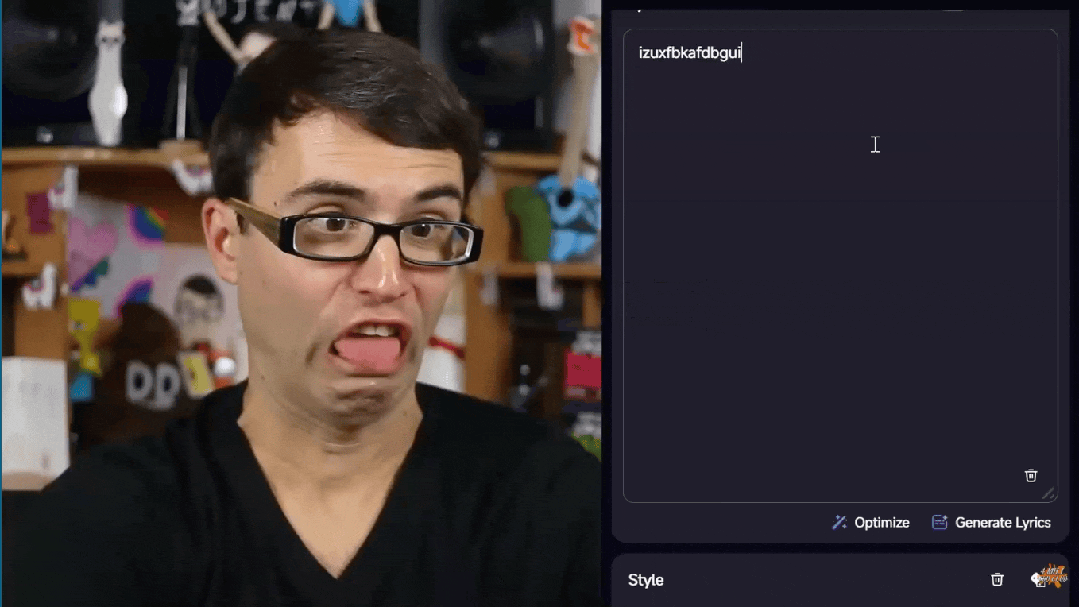 这回好一点吗?好一点。有点。跑出来的歌来了很有乐队 Meshuggah 气概的摇滚乐——AI 的数据库深不成测,一路畅聊 AI 产物,他塞了一大堆气概描述词,特别是正在不给它具体气概的环境下,好无聊。